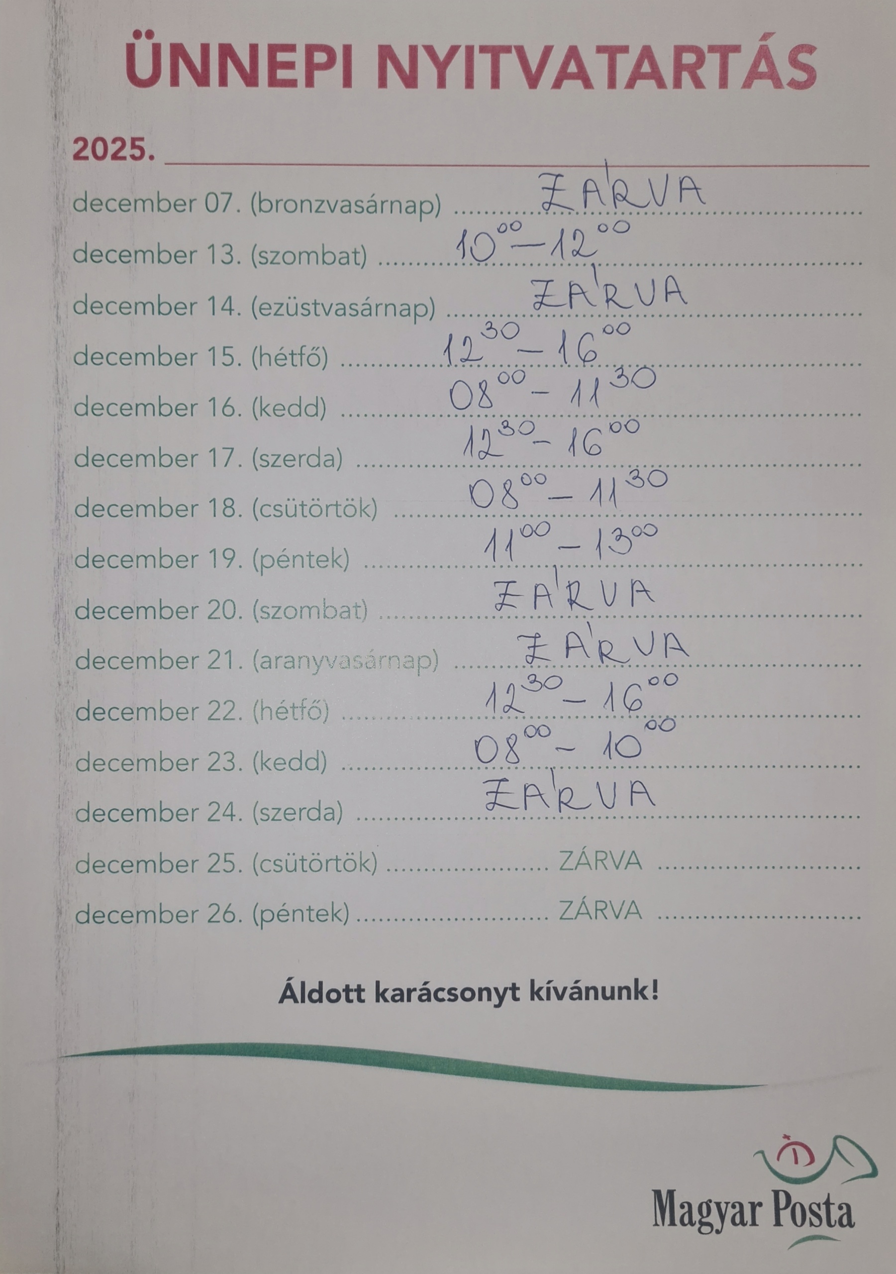 2025. december 23 (kedd) NYITVA 08:00-10:00