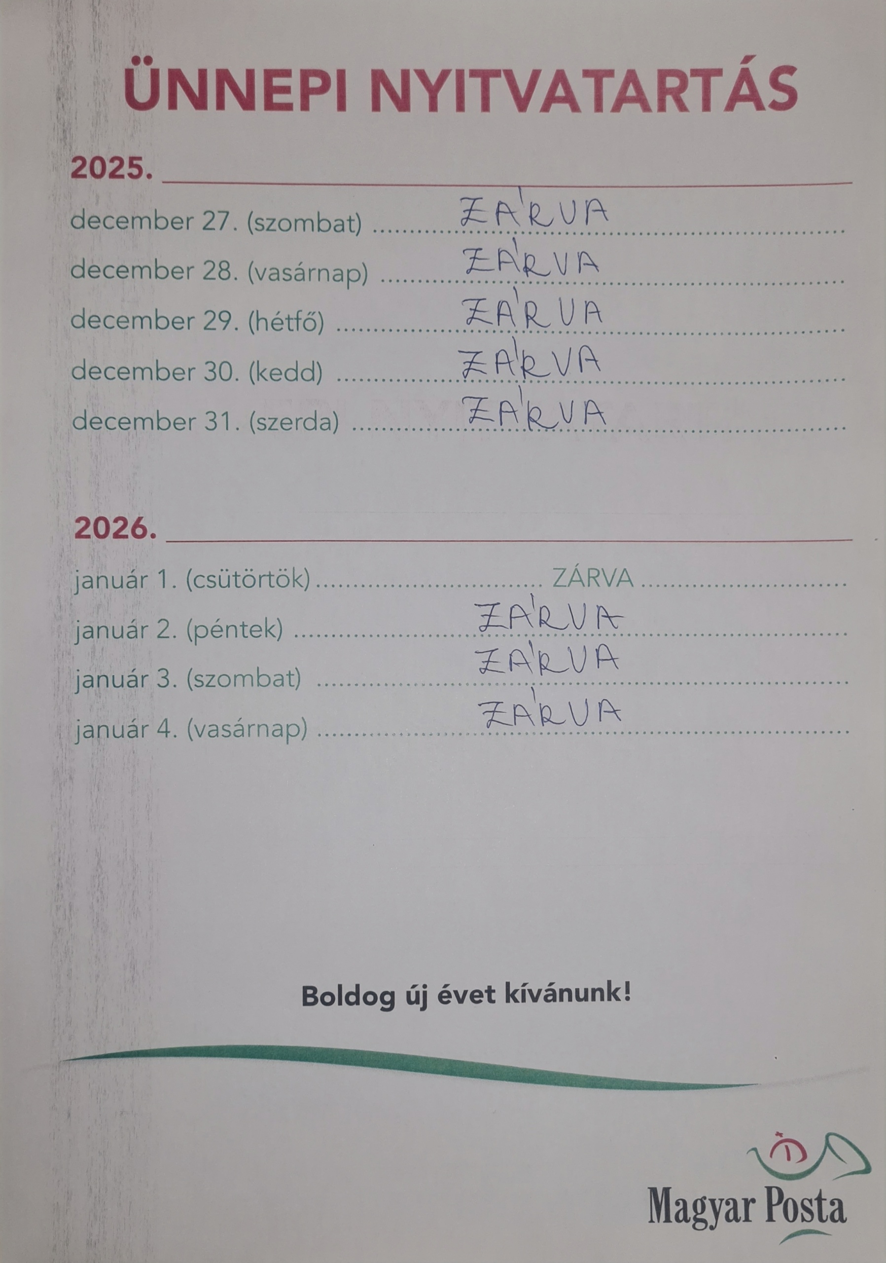 Egyéb napokon az újkéri postapartner ZÁRVA tart